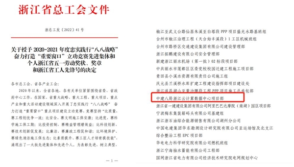 “五一”国际劳动节来临之际,云计算数据中心项目被浙江省总工会评为立功竞赛先进班组,授予“浙江省工人先锋号”称号。浙江省总工会文件云计算数据中心项目是浙江省新基建的重点项目,备受省领导关注,是以新发展理念引领、技术创新驱动、信息网络为基础的数字浙江“一号工程”,同时也是深化数字浙江建设的有效抓手,建成后将成为未来国内最节...