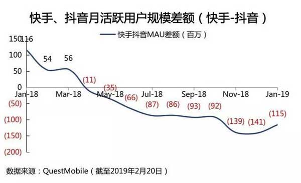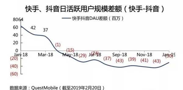 截止2019年1月19日,二者的日活差距缩小为3000万。