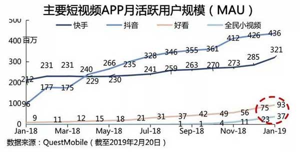 由图可见,截止2019年1月19日,好看视频的月活为9300万,同比增长904%;全民小视频的月活为3700万,环比增长60%。