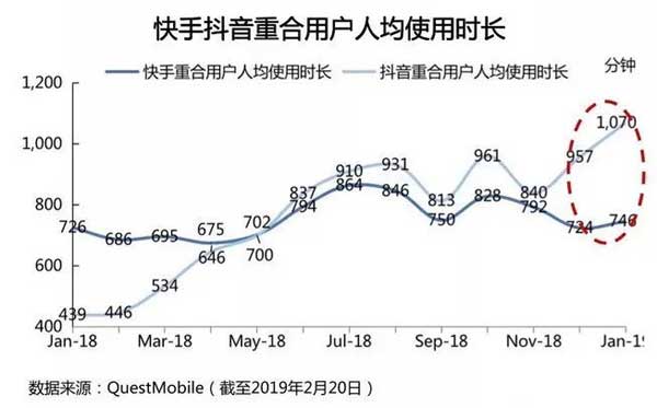 二者的重合用户中,抖音重合用户人均使用时长高于快手,并在2018年11月之后呈现扩大趋势。截止2019年1月,抖音重合用户人均使用时长为1070分钟,快手为746分钟。