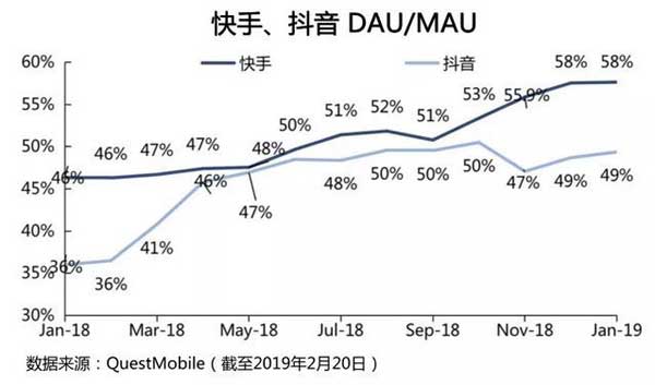 DAU/MAU可以反映出用户粘性,从数据可见,快手的DAU/MAU一直高于抖音,并在2018年11月之后逐步扩大,可见快手的用户粘性高于抖音,快手用户对平台的忠诚度更高。