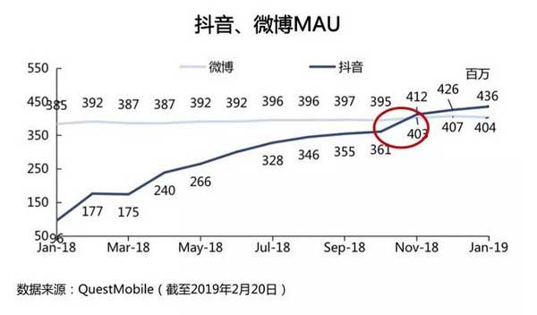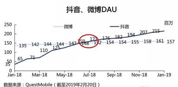 此外,抖音与微博的数据也进行了对比。数据显示,抖音的日活、月活已经超过微博,而且差距还在逐渐扩大。