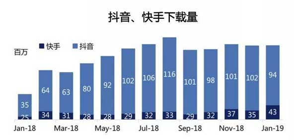下载量方面,从体量而言,抖音远远大于快手。在2018年1月至2019年1月期间,抖音单月最高下载量为11600万,快手最高为4300万。