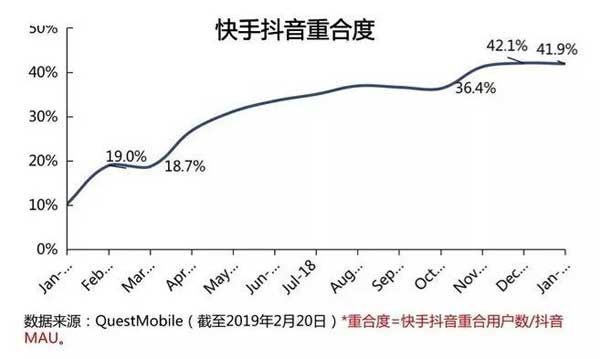 从快手抖音用户重合度曲线可见,从2018年4月开始,快手抖音的用户重合度处于上升趋势,但在2019年1月出现小幅下降。不过,截止2019年1月,二者的用户重合度已经达到了41.9%。