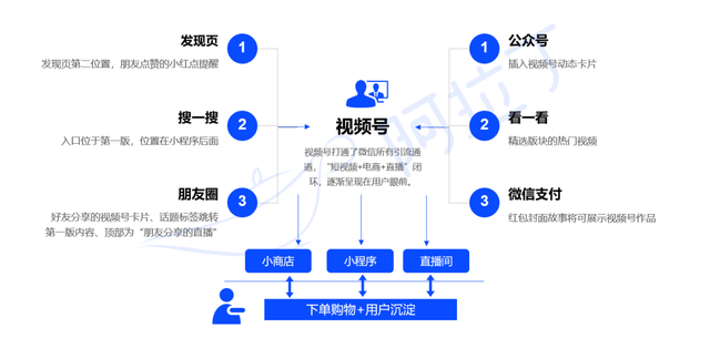 视频号与小程序连通,通过视频內容更多样化吸引客户进入小程序。未来视频号作为关键的总流量通道,会最终引流至小程序,打造短路径商业变现。
