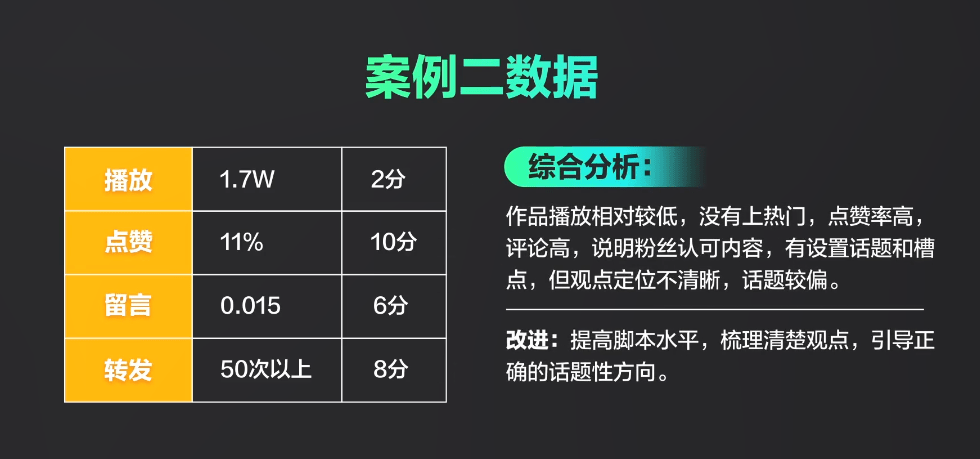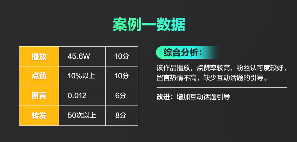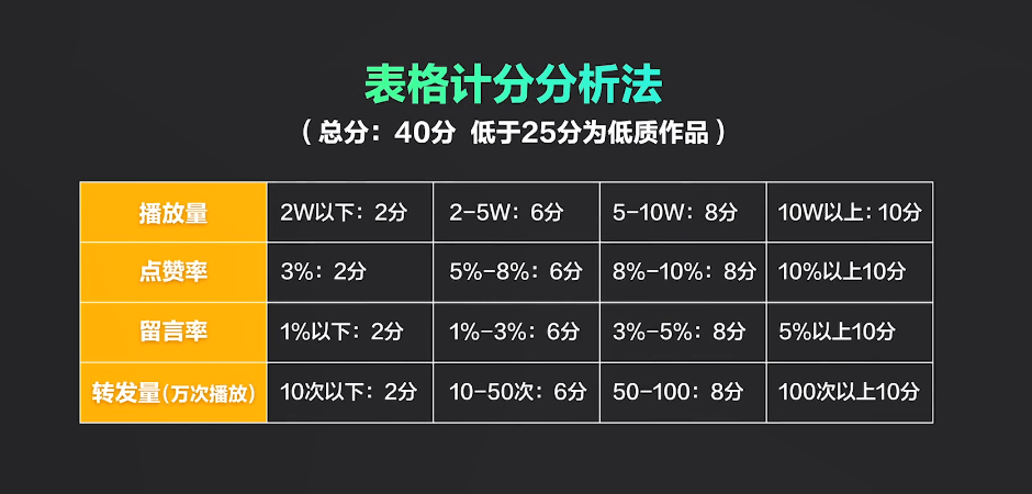 毕竟抖音是个黑盒,也是不断变化的,一般来说,普通账号分析播放量、点赞率、评论率、转发量这几个数据就可以了,这里我给大家分享一个超实用的分析工具表格计分分析法,一般选择24小时或者48小时进行分析,方便做横向对比。