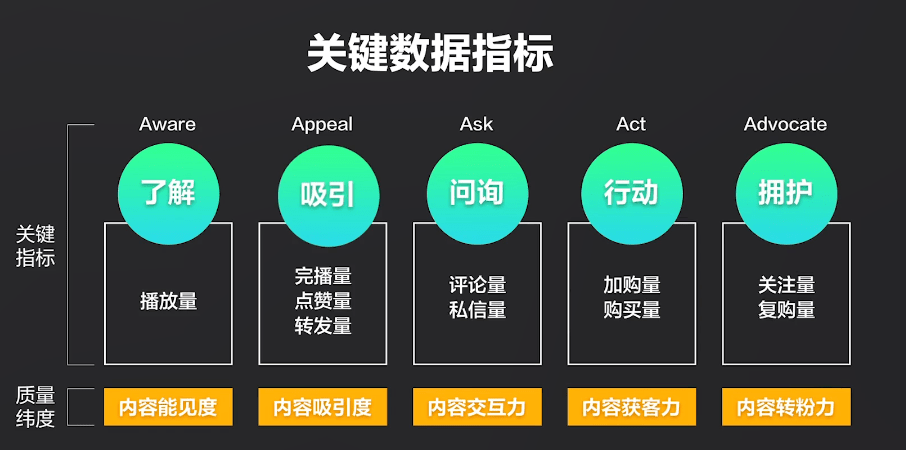 这就得说到关键的几个数据指标了,内容能见度、吸引度、交互力、获客力、转粉力,也就是后台的完播量、评论量、加购量、关注量、播放量、点赞量、私信量、购买量、复购量、转发量,当然数据指标肯定不止这些。