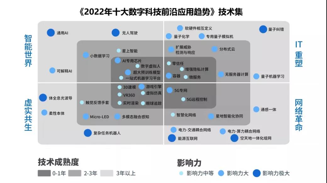 同时,我们对十大技术趋势做了进一步的打开,根据技术成熟度和影响力,细分为IT重塑、网络革命、智能世界和虚实共生四大领域。