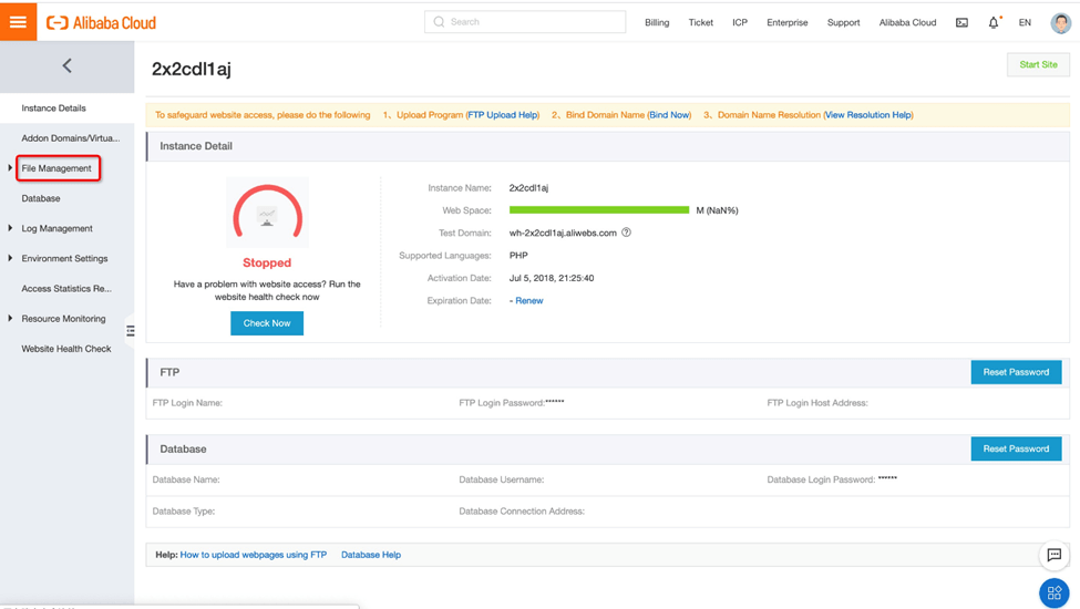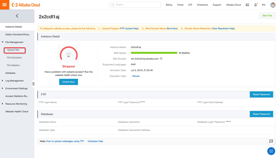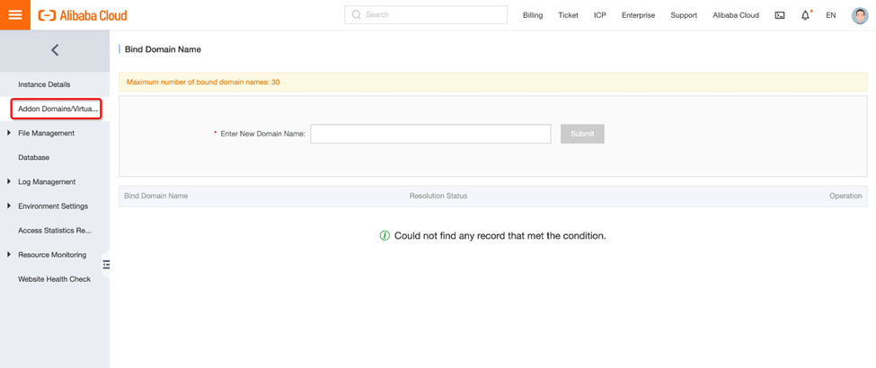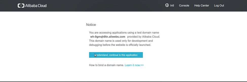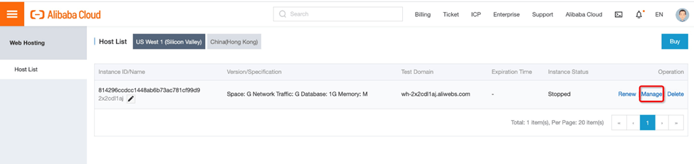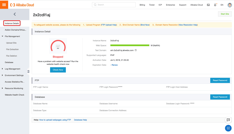 5. 在虚拟主机管理页面上,转到实例详细信息。在这里,我们可以获得阿里云提供的测试域名。请注意,此域名严格用于测试目的。