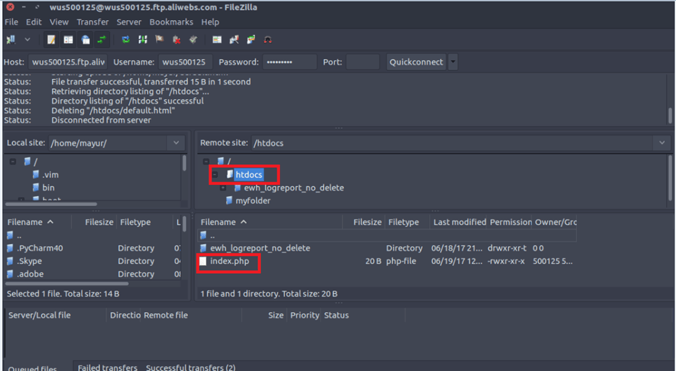 4. 在 htdocs 文件夹中上传您的代码库。您可以上传静态HTML文件和动态文件,如PHP,Wordpress或Drupal。在这里,我们正在上传一个索引.php文件,其中包含我们特定网站的phpinfo。