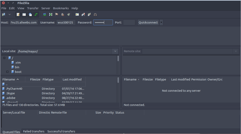 2. 打开 Filezilla 并输入从虚拟主机管理控制台获取的主机名、用户名和密码以启用快速连接。