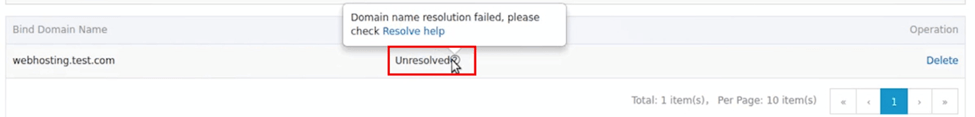 3. 访问您的域名注册商,使用 CNAME 将您的域名解析为 *.aliwebs.com。完成后,解决状态将为"已解决"。