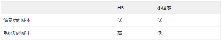 对于简单功能,H5 和小程序的开发成本是差不多的,开发模式和语言风格也类似。而对于前面说到的系统能力,可能就只有小程序才能实现,H5 根本做不了。此外,小程序自成体系,因此也有一些现成的组件可以使用,如果刚好覆盖了你的产品功能就能提升效率。