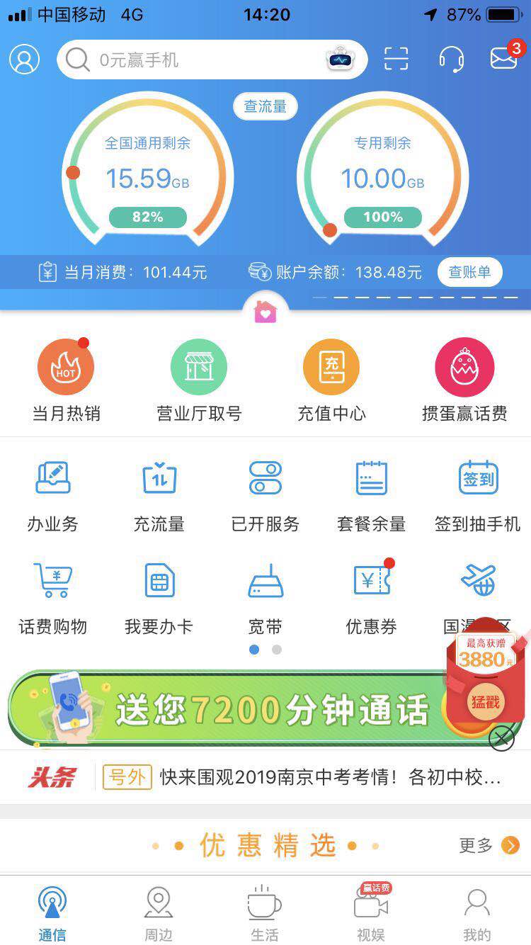 APP主要以业务办理、业务查询、活动办理为主,实现移动业务、活动的全量承载,满足用户对移动业务的所有诉求,是一个大而全的产品,可以和移动营业厅相比——有一句叫“24小时不打烊的营业厅”。同时,也增加了周边、生活、视频这样的互联网生活频道,在满足移动业务办理的同时,还可以参与和生活相关的业务。